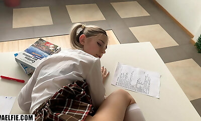 une écolière se couche et donne un joli travail en fusion