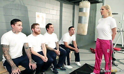 ebony beefcake trainer baise une brève beauté blonde dans la salle de gym