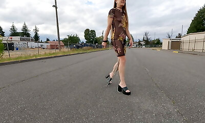 Longpussy, out for a walk, Huge Pussy Plug, Sheer Top, High Heels, Hip Highs and a Brief Miniskirt in Public!