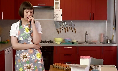 Small udders solo babe Sandy Cheeks masturbates in the kitchen