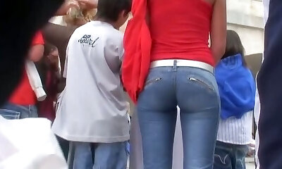 坦率街灰金发性感臀部在绷紧的牛仔裤